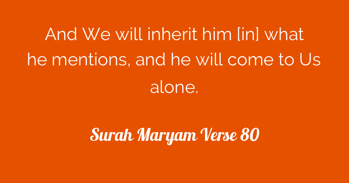 Surah maryam(مريم) 19:80 and we will inherit him in what he mentions,1 and he will come to us alone.